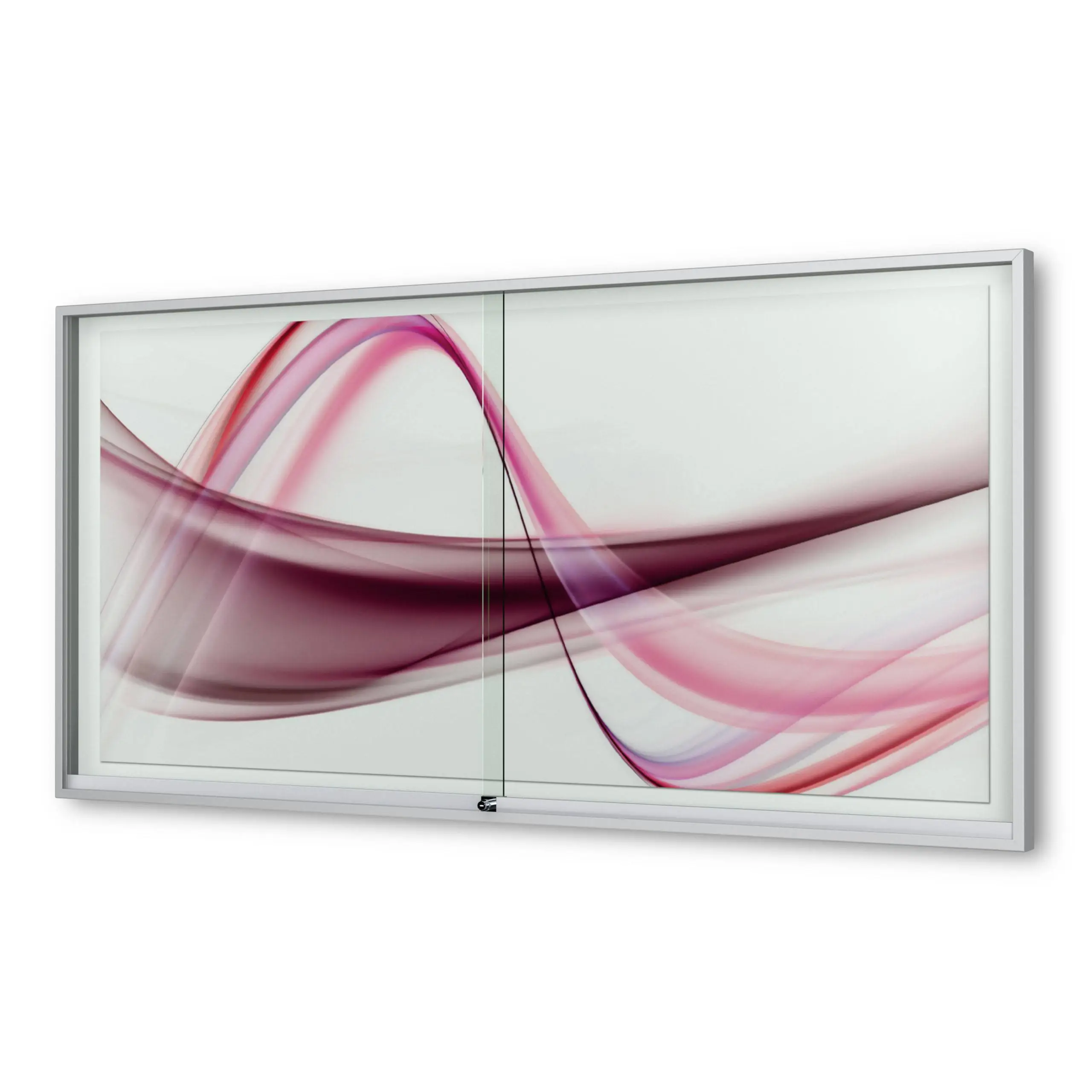 Schaukasten Fortis - eckig - mit Schiebetüren - 60 mm Gehäusetiefe, rollengelagerte Schiebetüren, höchster Brandschutz (A1) Größe - 8 × DIN A4 • 930 × 695 mm Öffnung - rollengelagerte SchiebetürenVerglasung - Einscheiben-Sicherheitsglas / ESGOberfläche - Eloxierung in matt-silber (E6/EV1)Beleuchtung - ohne BeleuchtungSchließung - Sicherheitsschlösser mit je 2 SchlüsselnRückwand - weiße, magnethaftende Rückwand inkl. 10 Magnete