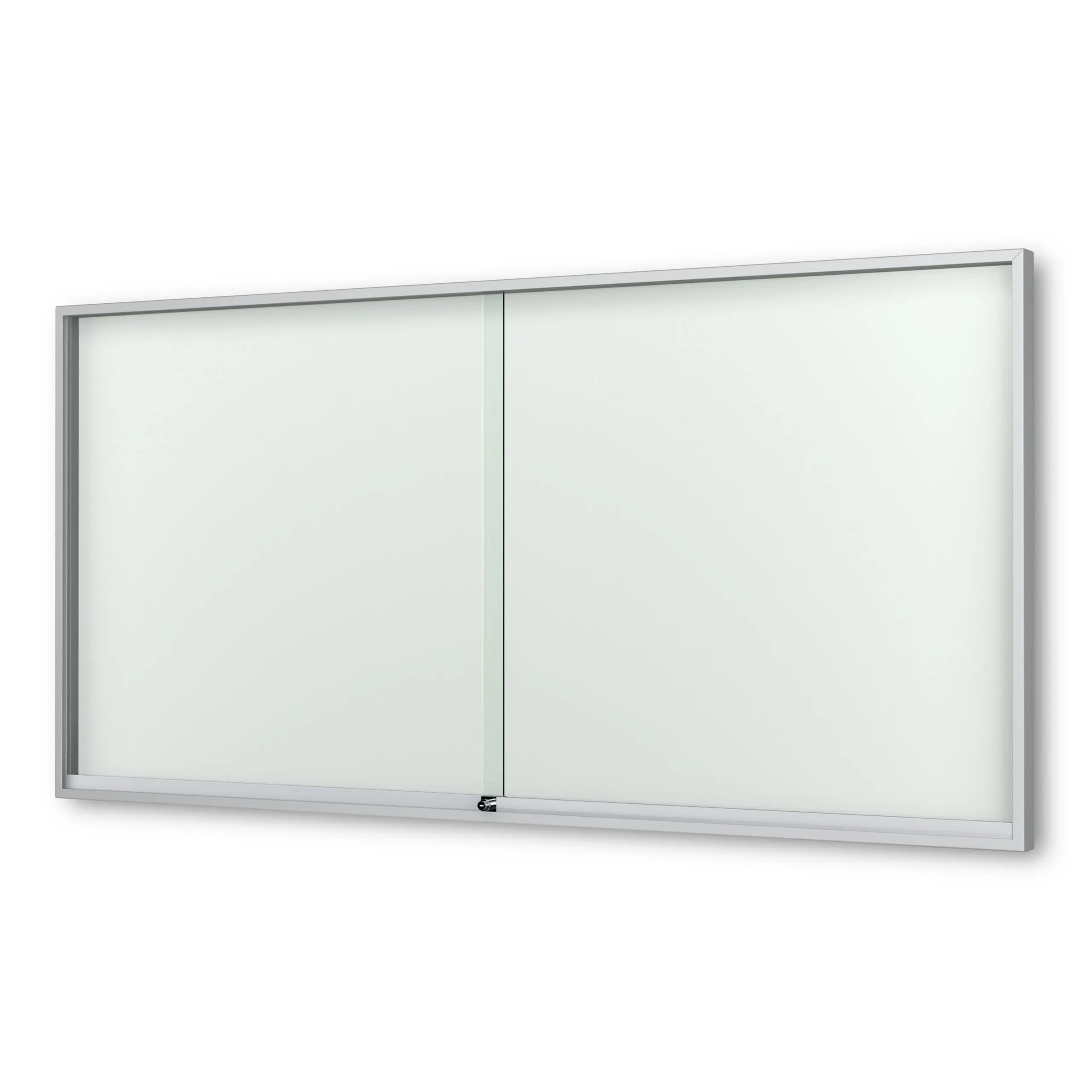 Schaukasten Fortis - eckig - mit Schiebetüren - 60 mm Gehäusetiefe, rollengelagerte Schiebetüren, höchster Brandschutz (A1) Größe - 8 × DIN A4 • 930 × 695 mm Öffnung - rollengelagerte SchiebetürenVerglasung - Einscheiben-Sicherheitsglas / ESGOberfläche - Eloxierung in matt-silber (E6/EV1)Beleuchtung - ohne BeleuchtungSchließung - Sicherheitsschlösser mit je 2 SchlüsselnRückwand - weiße, magnethaftende Rückwand inkl. 10 Magnete